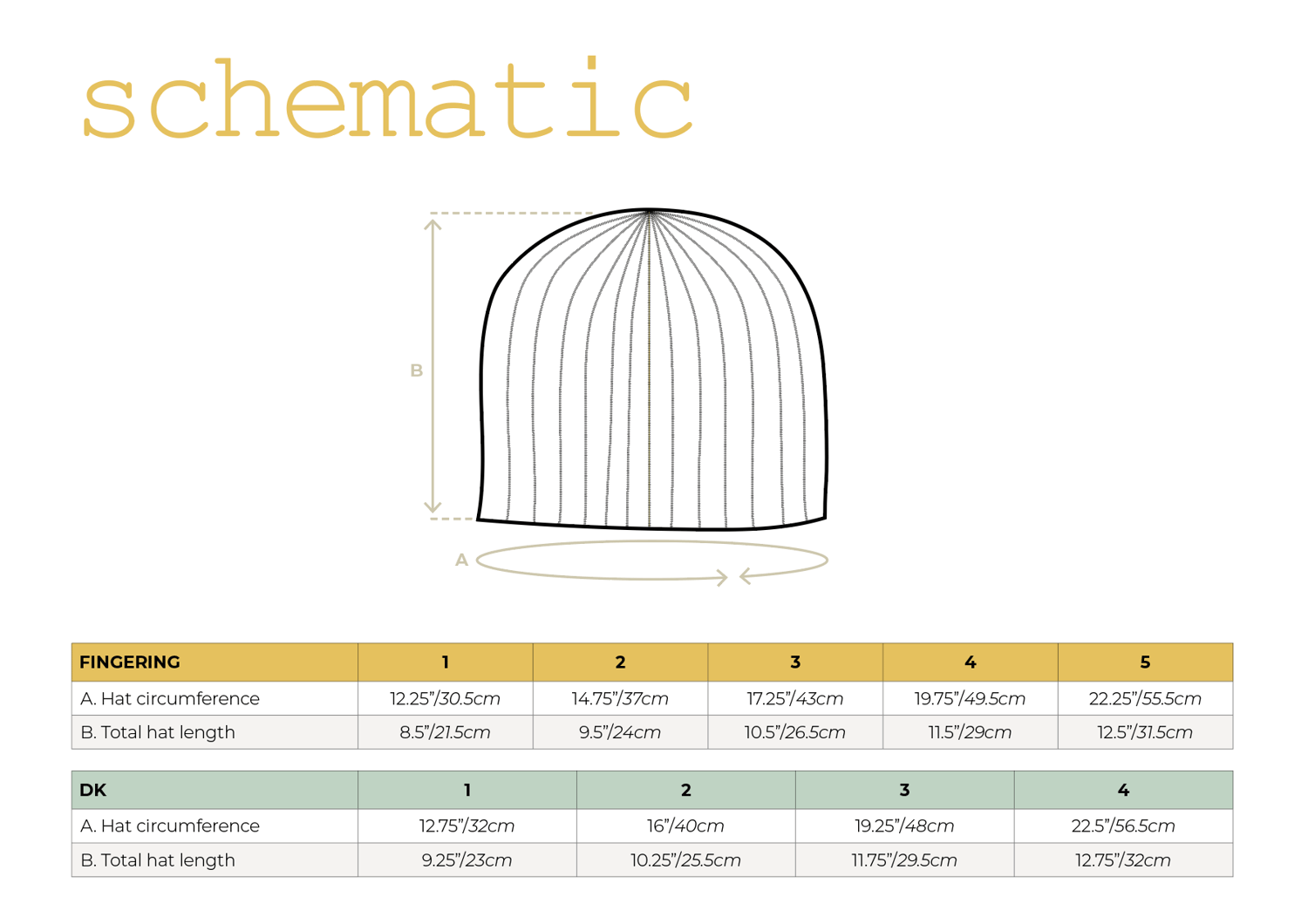 The pattern includes numbers for fingering weight and dk weight yarn, with 5 sizes from newborn through adult large.