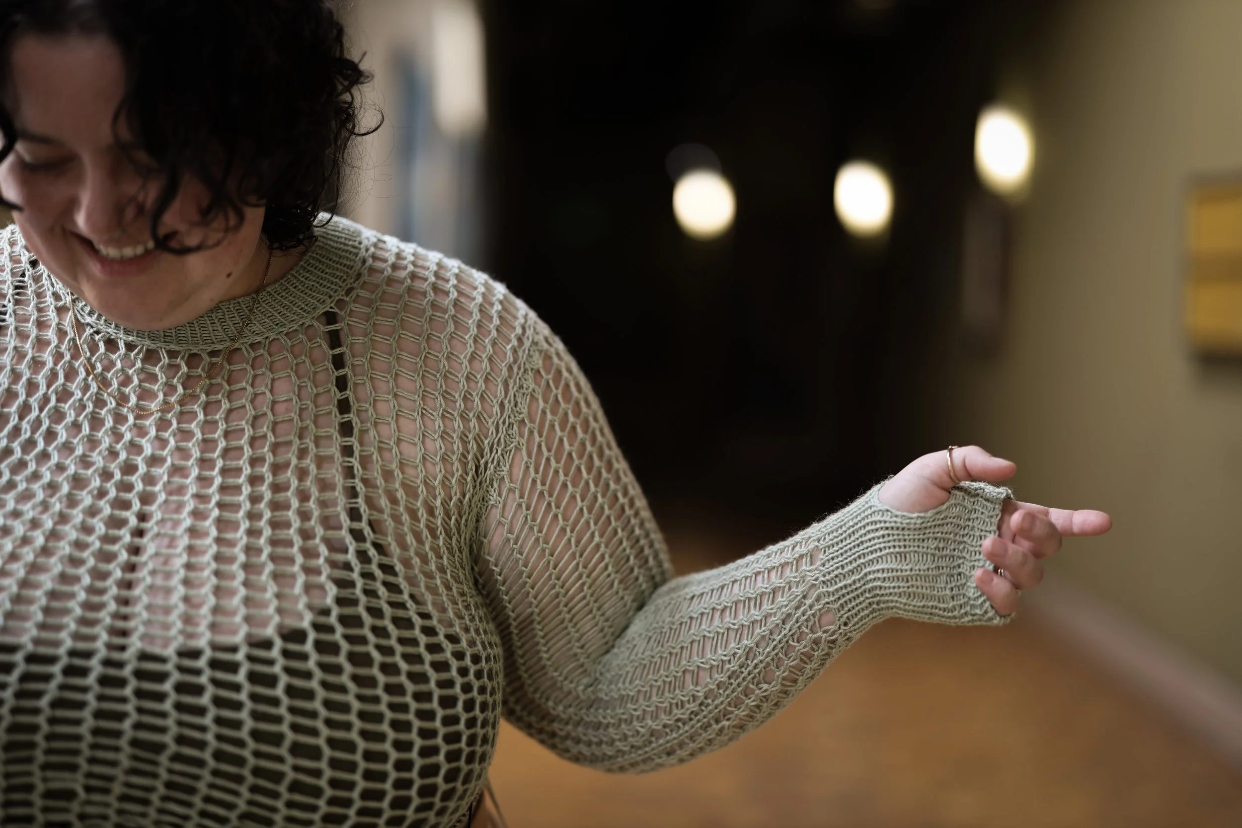 This pattern is for a top-down fitted all-over hex mesh top with a crew neck in 1x1 ribbing and options for sleeveless, short sleeves, or long sleeves with thumb holes.